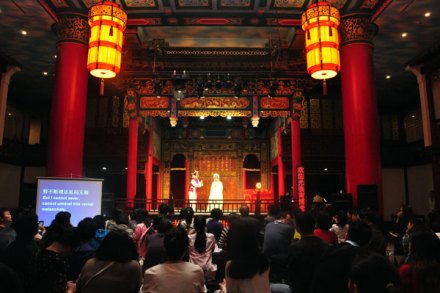 民俗茶社:民俗茶社是一座全木結(jié)構(gòu)仿古茶社,精湛地展現(xiàn)了非物質(zhì)文化遺產(chǎn)項(xiàng)目——香山幫傳統(tǒng)建筑營造技藝。茶社完全按照老式茶社布局修建,天井蘇式彩畫艷麗奪目,戲臺金碧輝煌,木雕隔斷精致巧妙,池心敞亮寬闊,包廂整肅典雅,是觀眾欣賞江蘇省表演類非遺項(xiàng)目和品味江蘇省飲食技藝類非遺項(xiàng)目的最佳場所,是“動(dòng)態(tài)”展示非物質(zhì)文化遺產(chǎn)的文化空間。在這里,將定期上演江蘇特有的曲藝、傳統(tǒng)戲劇折子戲和民間音樂等項(xiàng)目,如蘇州評彈、南京白局、昆曲折子戲、江南絲竹等等;并采用傳統(tǒng)茶館中“葷茶館”的形式;把南京雨花茶、蘇州洞庭碧螺春、連云港云霧茶等進(jìn)入非遺名錄的茶飲和其他飲食項(xiàng)目同時(shí)納入其中。演出時(shí)間為每天下午14:30—15:30,具體演出項(xiàng)目請關(guān)注屏幕導(dǎo)覽和南博網(wǎng)站。
