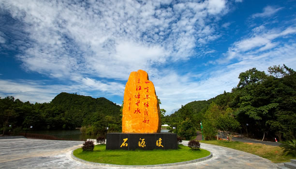 護(hù)源石是2017年紀(jì)念香港回歸20周年時所立,石碑上“一定要保護(hù)好東江源頭水”為周恩來總理的親筆題詞。1963年,香港遭遇了60多年來最嚴(yán)重的一次干旱,350萬人的生活因缺水陷入困境。當(dāng)年12月,周恩來總理親自批示,撥專款用了11個月的時間在深圳建成了東深供水工程,把東江的水引到香港,從此結(jié)束了香港長期缺水的歷史。護(hù)源石形狀像一只手掌,寓意用手護(hù)源,石頭高5.23米,與東江流域長度523公里相對應(yīng),寬3米,代表贛、粵、港三地;護(hù)源石底座長4.65米,與三百山到香港的距離465公里相對應(yīng);花壇采用圓形,寓意“圓圓滿滿”。
