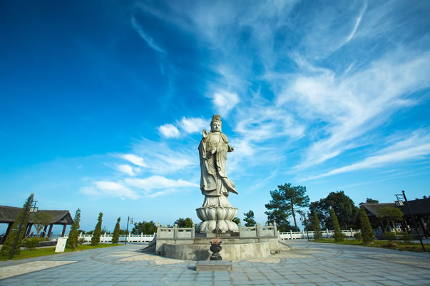 滴水觀音菩薩雕像于2007年香港回歸10周年贛粵港信眾捐建,其寶相慈祥莊嚴(yán),左手持凈瓶,右手做法印,屹立在三百山東江的源頭。雕像總高11.69米,與主峰海拔相稱。雕像的形態(tài)、手法符合佛教的意義,具備當(dāng)今美學(xué)、建筑學(xué)、雕塑學(xué)、佛像藝術(shù)的時代特色。