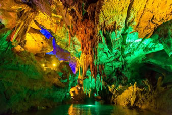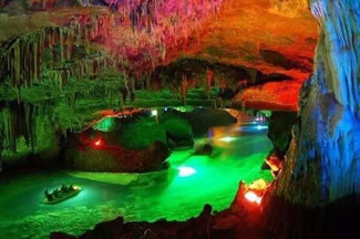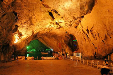 通往水洞的碼頭,千余平方米的水面,宛如一幽靜別致的“港灣”,燈光所及,水中游船、洞中石景倒映其中,使人如入仙境。從護(hù)岸石階拾級而下,通過長廊從碼頭上船,即可暢游水洞。水洞全長5800米,現(xiàn)已開發(fā)2800米,面積3.6萬平方米,空間40余萬立方米,最開闊處高38米,寬70米。