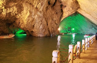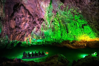 它們維妙維肖,形象逼真。特別是玉米塔、玉象和雪山三景,更是名實相符,幾可亂真。銀河兩岸鐘乳林立,石筍如畫,千姿百態(tài),光怪陸離,洞頂空窿鐘乳高懸,晶瑩斑斕,神趣盎然,沿河景點(diǎn)達(dá)100余處,千姿百態(tài),各具特色,泛舟其中,如臨仙境,這是水與石渾然天成的神秘洞穴,是迄今世界上已發(fā)現(xiàn)的最長可乘船游覽的地下暗河。