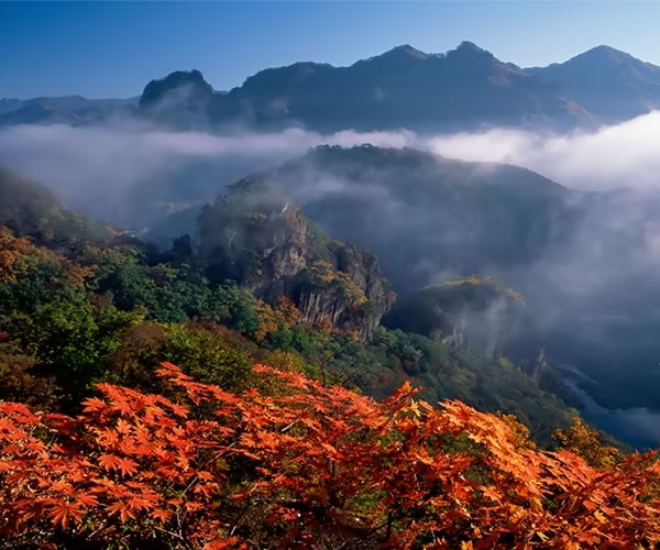 關(guān)門山位于遼寧省本溪縣南部,自古就有“東北黃山”、“東北桂林”之美譽。因雙峰對峙,一闊一窄,一大一小,其狀如門,故稱關(guān)門山。