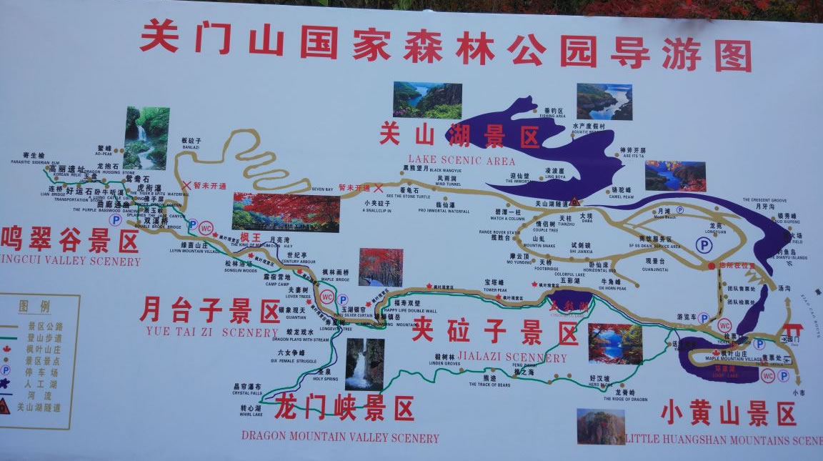 森林公園內(nèi)有四大景區(qū)小黃山景區(qū)、夾砬子景區(qū)、龍門峽景區(qū)和月臺子景區(qū),共計108處景點。它有三道門:北門,在小市方向,雙峰對峙,中間拱橋相連;南門,在去湯溝的嶺頂,公路從中穿過,十分險要;中門,在深谷河道中,“雙扉”夾水,寬只二十余米,為興修水庫的天然門柱,有人把關(guān)門山風(fēng)景譽為“小江南”,“賽黃山”,說它有五美:山美,陡峭,俊秀,似一簇簇盆景;樹美,樹木種類繁多,特別是秋天的楓葉,冬季植根于峭壁上的蒼松,非常壯觀;水美,湯河穿過山谷,匯集小溪,飛瀑,“奪門”而出,似來自于天際;花美,天女木蘭,山杜鵑,漫山遍野;云美麗,清晨雨后,山谷中云霧繚繞,如披輕紗,分外嫵媚。歷代文人多有詩篇贊頌,許多美術(shù)工作者,經(jīng)常到這里寫生、作畫。
