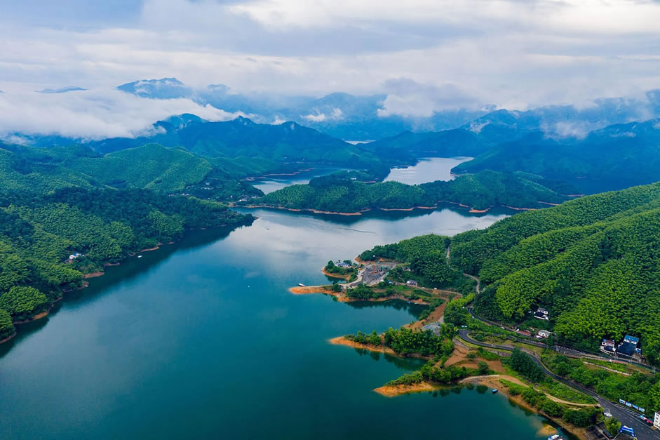 九龍湖風景區(qū),位于浙江省寧波市鎮(zhèn)海區(qū)九龍湖鎮(zhèn)境內,原為慈溪縣(今慈城)河頭鄉(xiāng)河頭市,距慈溪老縣城(慈城)約15公里,距寧波市中心約20公里。十字路水庫,別名九龍湖,水庫位于達蓬山以南,處于姚江流域,水域面積3平方公里,始建于1977年,1979年建成,包含九龍湖水庫、小洞岙水庫、郎家坪水庫和三圣殿水庫四個水庫,是鎮(zhèn)海區(qū)飲用水源地,國家4A級旅游景區(qū)。湖周黛峰如眉,翠嶺逶迤;湖中碧波如鏡,嵐影倒懸。波光藍天一色,綠樹修竹相映,景色極為旖旎。湖北側,九龍山偉岸挺拔,九個山頭和九條山脊并列一起,猶如九條臥龍伏地,綿亙數(shù)里,九龍山和九龍湖之名,皆藉此而來。時人有“九龍盤青山,松竹映碧波”的詩句,描述九龍山和九龍湖的景致。湖東北,是大蓬山,亦名達蓬山,海拔315米,山勢崢嶸,崖巖危突,登頂可眺望東海。