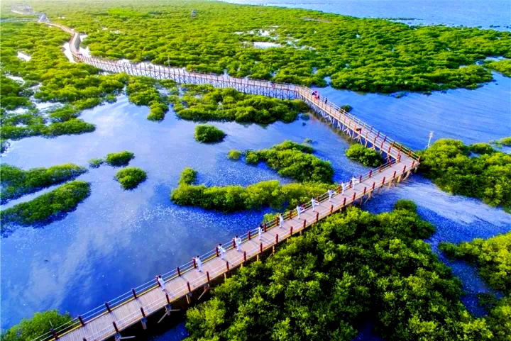 - 紅樹林生態(tài)區(qū):綿延6公里的生態(tài)海岸線,漲潮時呈現(xiàn)“海上森林”奇觀,退潮時灘涂可見招潮蟹、彈涂魚等生物,適合觀鳥、攝影。