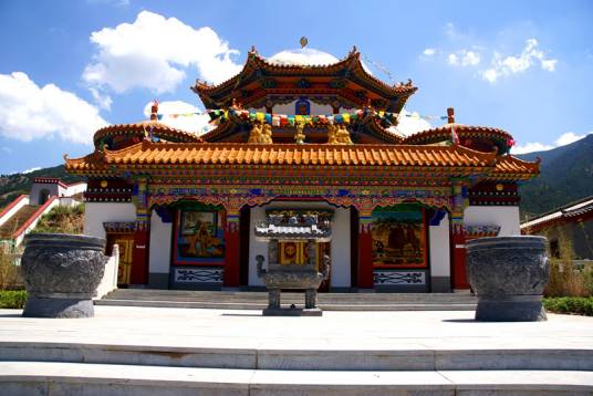 廣宗寺,其整個建筑氣勢宏偉,富麗堂皇。主要建筑有大雄寶殿、大經(jīng)堂、黃樓寺等。其中供奉西藏第六世達賴喇嘛遺體寶塔的大殿稱為“黃樓寺”。黃樓寺是一座兩層樓閣的建筑,其前部為81間,后部為49間,全部用黃、綠色琉璃瓦砌成,極為富麗。
