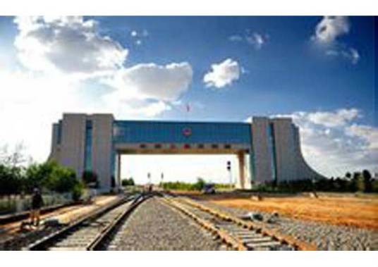 國門莊嚴肅穆,在國門乳白色的門體上方嵌著“中華人民共和國”七個鮮紅大字,上面懸掛的國徽閃著的金光,國際鐵路在下面通過。
