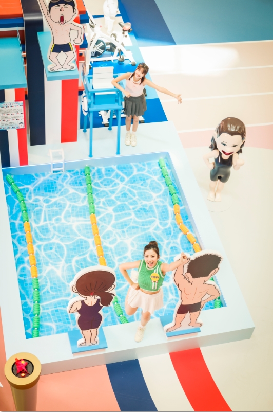 被譽(yù)為“超級女飛魚”的香港知名游泳運(yùn)動員站在泳池旁為飛魚們加油打氣,貪玩的Cuson則走到跳水臺上扮演跳水高手準(zhǔn)備一躍水中,讓人忍俊不禁,游客們可以走進(jìn)清澈的泳池內(nèi),與游泳運(yùn)動員們來一場別開生面的“混合挑戰(zhàn)賽”。