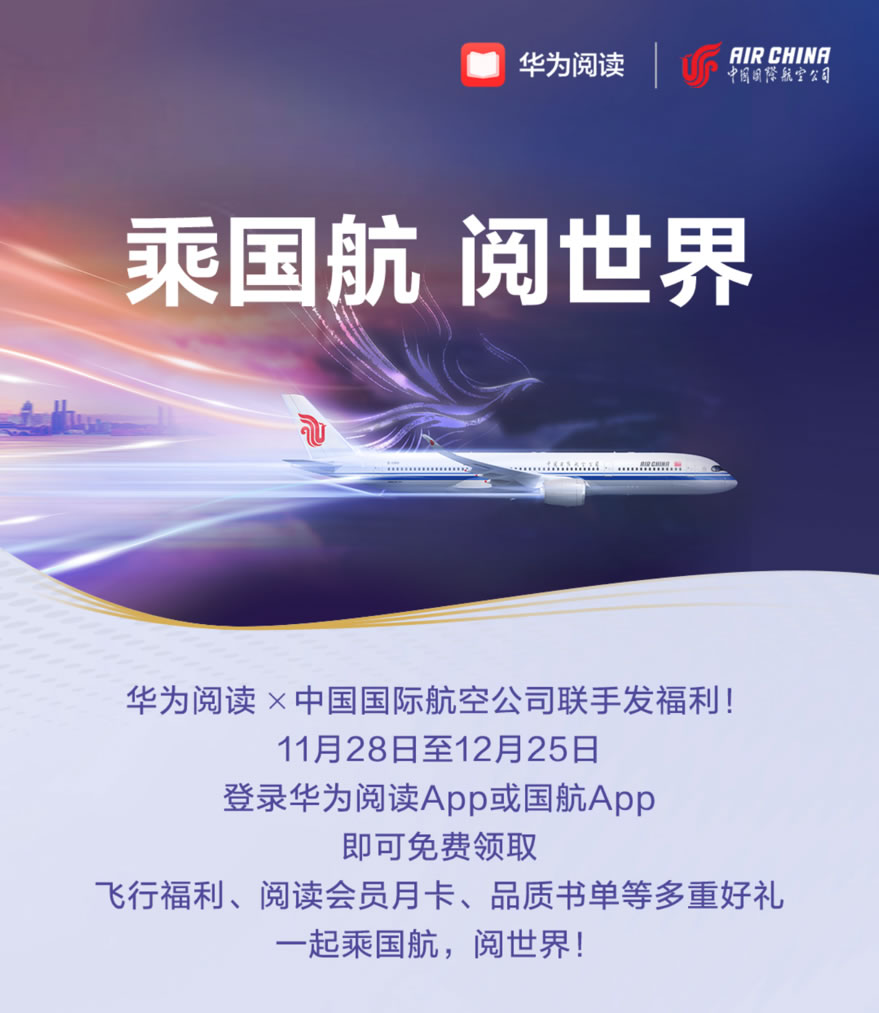 為了豐富旅客的飛行時(shí)光,近日華為閱讀與中國(guó)國(guó)際航空公司攜手,正式啟動(dòng)了“乘國(guó)航 閱世界”國(guó)航伴讀計(jì)劃,該計(jì)劃通過(guò)整合華為閱讀的豐富資源與國(guó)航的全球航線網(wǎng)絡(luò),為用戶打造一個(gè)旅行中的高品質(zhì)閱讀空間。參與此次活動(dòng)的用戶將可免費(fèi)領(lǐng)取3重好禮!包含了國(guó)航用戶多重福利、30天華為閱讀會(huì)員、精選國(guó)航伴讀書單,帶旅客悅享旅途的美好。