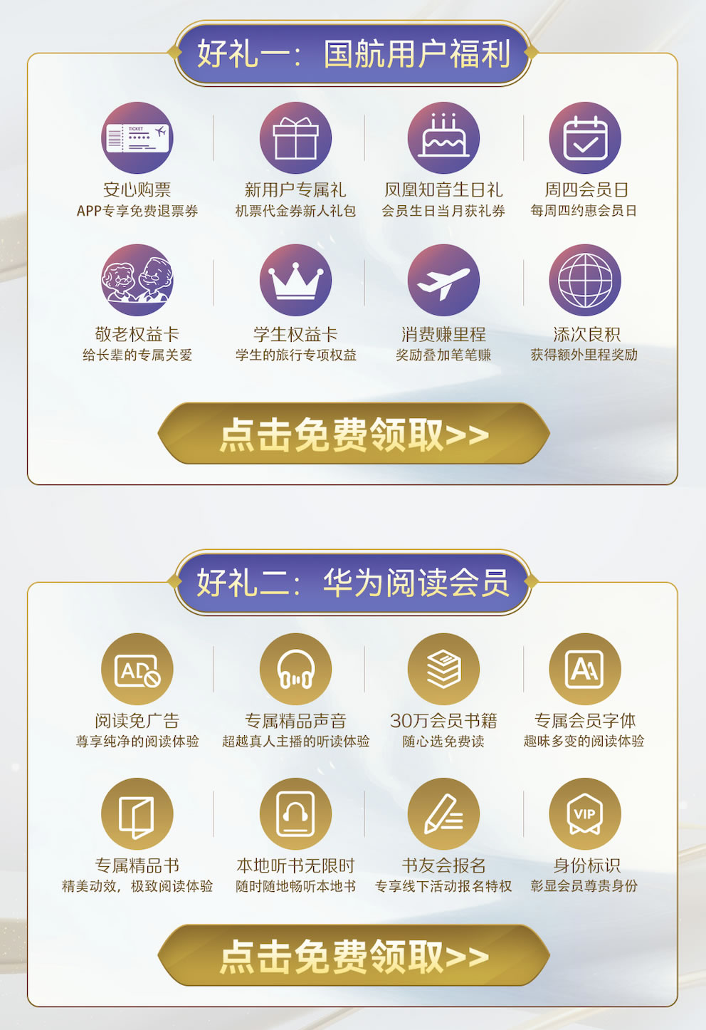 本次活動(dòng)中,國(guó)航為用戶提供了退票券、生日禮、敬老權(quán)益卡、學(xué)生權(quán)益、新人專屬禮券等一系列大禮包。華為閱讀則為國(guó)航的用戶提供了30天閱讀會(huì)員的專屬福利!領(lǐng)取后可以享受超百家知名出版社30萬(wàn)冊(cè)版權(quán)會(huì)員書籍免費(fèi)讀,不僅可以免費(fèi)使用專屬會(huì)員字體閱讀,還能獲得免廣告的純凈體驗(yàn)。同時(shí),喜愛聽書的用戶還可以使用專屬的精品聲音聽書,本地聽書無(wú)限時(shí),加入書架的書籍還內(nèi)置了專屬精品聲音,給用戶帶來(lái)超越真人主播的聽讀體驗(yàn)。華為閱讀還會(huì)定期組織線下書友會(huì),領(lǐng)取會(huì)員后可專享書友會(huì)優(yōu)先報(bào)名特權(quán)!