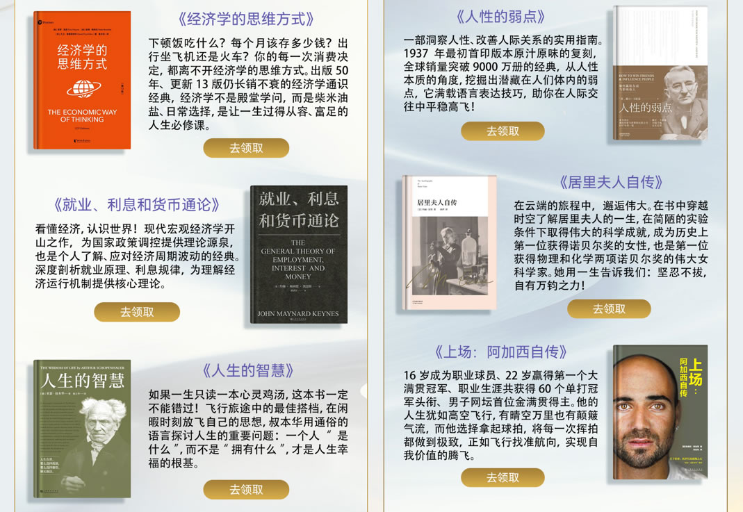 華為閱讀與國(guó)航共同精選了適合旅途閱讀的“國(guó)航伴讀書單”,包括《經(jīng)濟(jì)學(xué)的思維方式》、《就業(yè)、利息和貨幣通論》、《人生的智慧》、《人性的弱點(diǎn)》、《居里夫人自傳》、《上場(chǎng):阿加西自傳》等好評(píng)付費(fèi)書籍,并提供給國(guó)航用戶免費(fèi)閱讀,為乘客的飛行時(shí)光帶來(lái)更多精神享受。