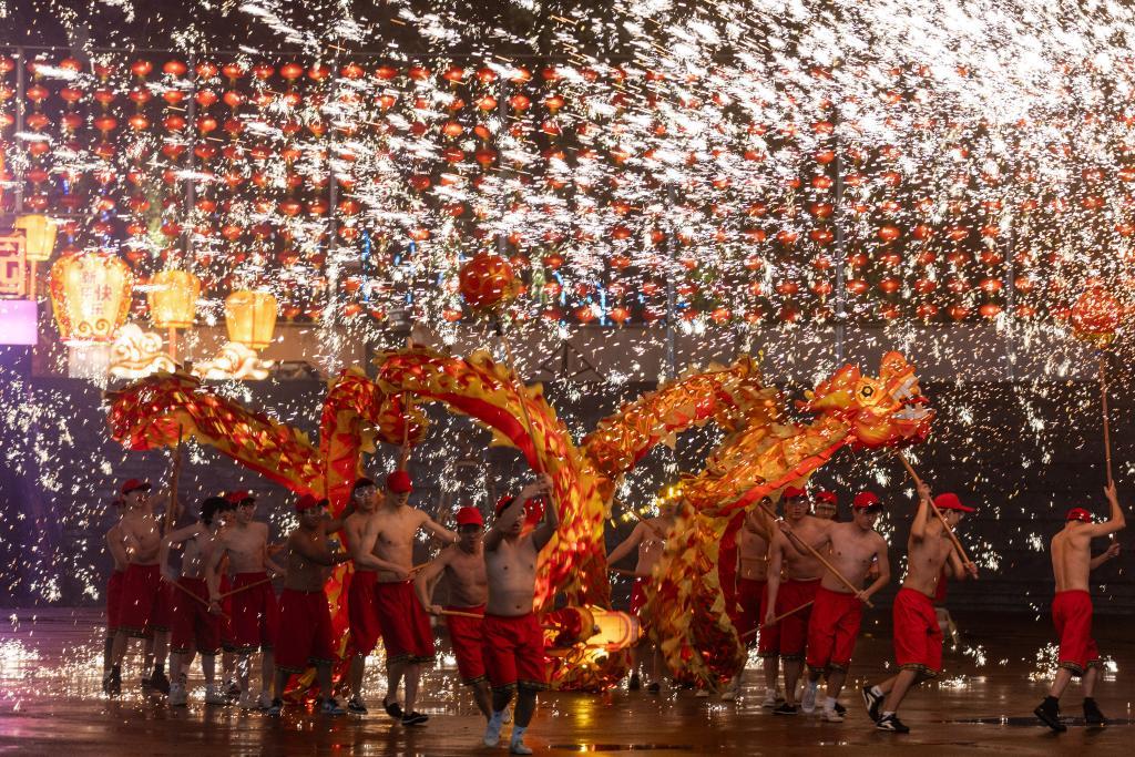 重慶市銅梁區(qū)奇彩夢(mèng)園景區(qū)的火龍表演。新華社記者黃偉 攝