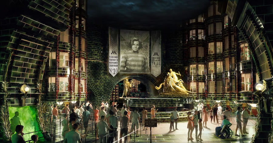 第二個矚目的新園區(qū)是哈利波特魔法世界(The Wizarding World of Harry Potter)的擴建園區(qū):并命名為魔法部之謎(Ministry of Magic),項目首次跳出了一期園區(qū)霍格沃茨與對角巷,深入《神奇動物》系列中1920年代的巴黎魔法部。喬治卡爾森(George Carlson)設計,英國全息視覺公司Holovis打造的 “魔法部時空電梯(Ministry Time-Turner Elevator)”將無縫穿梭紐約、倫敦與巴黎,采用4D投影實時渲染窗外街景,形成極具震撼力的沉浸式魔法場景體驗。而 “默默然防御訓練(Obscurial Escape)” 多人射擊游戲,需用魔杖擊退熱感應投影的黑暗生物,積分實時影響勛章等級,將游客互動參與性帶入全新的高度。
