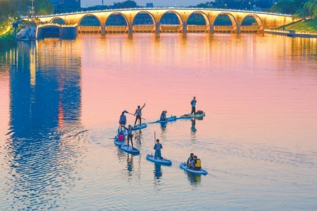 水聲、指導(dǎo)聲,夾雜著成功駕馭后的歡呼聲,交織成大運(yùn)河上獨(dú)特的活力樂(lè)章。微風(fēng)拂過(guò),帶來(lái)水汽的清涼,也吹散了一些夏日燥熱。阿珂說(shuō),俱樂(lè)部正在推廣“城市微度假、微旅行”的理念,給年輕人打造一個(gè)不用出遠(yuǎn)門就有休閑度假感的娛樂(lè)解壓場(chǎng)景。“大運(yùn)河比城里的護(hù)城河、亮馬河寬闊得多,傍晚時(shí)分波光粼粼的感覺(jué)棒極了!濱水休閑步道以及各類配套服務(wù)設(shè)施也挺完善,真的很適合微度假。”他說(shuō),接下來(lái)希望能帶更多人在大運(yùn)河上體驗(yàn)槳板運(yùn)動(dòng)的快樂(lè)。
