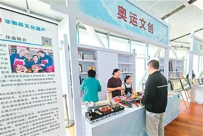 設(shè)在張家口市崇禮區(qū)國(guó)家跳臺(tái)滑雪中心內(nèi)的非遺手工藝品展臺(tái)。