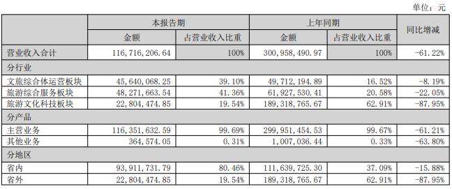 財報顯示,最近幾年,公司文旅科技板塊的營收占比均在50%以上,是公司的主要驅(qū)動力,然而今年上半年,公司文旅科技板塊營收僅有2280.45萬元,占比19.54%,縮水嚴重。
