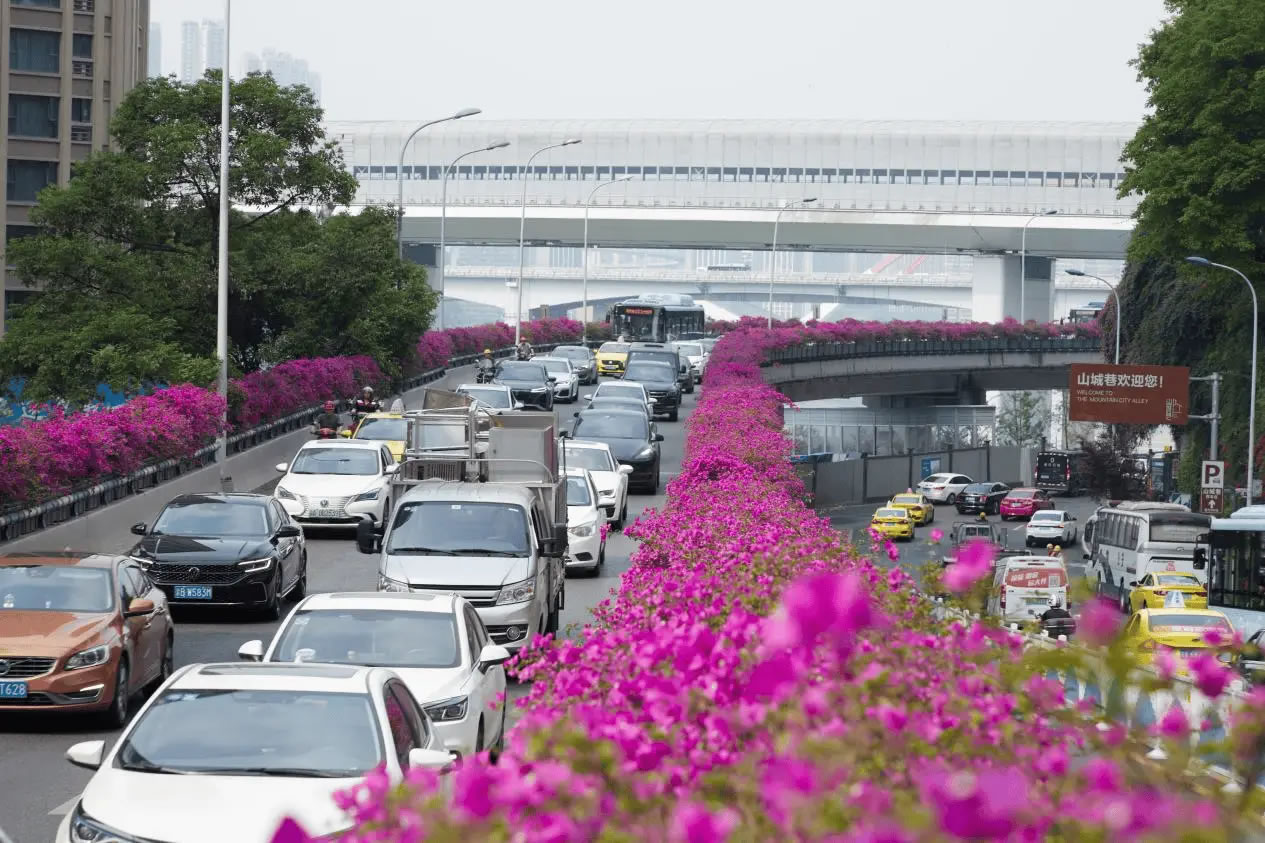 依托密集的立體交通網(wǎng)絡(luò),渝中區(qū)聚焦立交高架、人行天橋、軌道墩柱,打造四季有綠、全年可觀的路上風(fēng)景線(xiàn),賦予城市交通色彩與活力。渝中區(qū)充分利用中興路高架橋兩側(cè)空間,通過(guò)鋼結(jié)構(gòu)支撐,加掛耐修剪、易養(yǎng)護(hù)的三角梅花箱,形成500米空中花廊。
