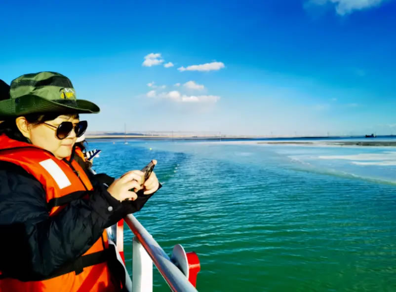 10月14日,由中共海西州委宣傳部主辦、西海都市報社承辦的“紅杞風光別樣美 ”活動,走進海西蒙古族藏族自治州烏蘭縣,研學團隊來到茶卡鹽湖,乘坐游船觀光,湖面上駛來的大型運鹽船讓外省記者及學生不由感嘆:沒想到“天空之鏡”還有另外一種獨特景致。湖面上駛來的大型運鹽船吸引了研學團隊成員的目光。采鹽船正在鹵水中作業(yè),發(fā)出低沉的轟鳴,空氣中彌漫著咸潤的氣息。研學的同學通過實地觀察鹵水的蒸發(fā)、結晶過程,將課本上的地理、化學知識,與這片壯麗的現(xiàn)實場景融會貫通。