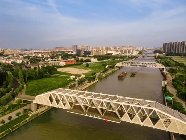 在滸墅關(guān),順應(yīng)民生所需,以文脈傳承、文化賦能滿足人民群眾對美好生活的向往,“紅房子”并非個例。就在距“紅房子”咫尺之遙的大運河上,造型別具一格的滸關(guān)南橋、北橋吸人眼球。橋身,大量運用三角形與菱形元素,充分彰顯現(xiàn)代結(jié)構(gòu)美學(xué);橋中,幾座“尖頂閣樓”突起,是特意營造的觀水場所;橋下,運河汩汩流淌,一艘艘貨輪推開波紋向前駛?cè)ァ?/p>