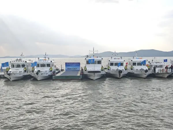 本次演練以“實(shí)戰(zhàn)導(dǎo)向、效果為先”為原則,模擬船舶碰撞、人員落水等極端場景,共分為旅游船舶開航前自查、旅游船舶環(huán)太湖聯(lián)動動態(tài)監(jiān)測、極端天氣旅游船舶應(yīng)對處置、旅游船舶險情處置、人員落水應(yīng)急處置5個科目。其中,旅游船舶開航前自查科目中,對照《中國籍船舶開航前自查清單》嚴(yán)格開展自查工作,確保船舶適航、人員適配,保證航行安全。環(huán)太湖旅游船舶聯(lián)動動態(tài)監(jiān)測科目驗(yàn)證了現(xiàn)有監(jiān)控系統(tǒng)對湖區(qū)船舶的精準(zhǔn)感知與實(shí)時管控能力,檢驗(yàn)了跨區(qū)域多部門協(xié)同響應(yīng)機(jī)制的可行性與高效性。極端天氣旅游船舶應(yīng)對處置科目模擬旅游船舶航行途中遭遇極端天氣,“蘇交執(zhí)法錫039”輪、“湖州執(zhí)法艇浙交巡0328”輪迅速進(jìn)入伴航狀態(tài),與游船配合形成“兩艇護(hù)一船”的防護(hù)陣形,全程護(hù)航,實(shí)時監(jiān)測周邊水域動態(tài)、規(guī)避潛在風(fēng)險,主動提供必要的航行協(xié)助。旅游船舶險情處置科目充分展示旅游船舶在航行過程中突發(fā)極端天氣的全過程應(yīng)對處置,包括預(yù)警接收、封航、應(yīng)急避險、協(xié)同數(shù)援、人員轉(zhuǎn)運(yùn)。人員落水應(yīng)急處置科目中,應(yīng)用無人機(jī)、遙控救生機(jī)器人新型智能裝備與數(shù)字化技術(shù),為最大限度挽救生命提供堅(jiān)實(shí)保障。