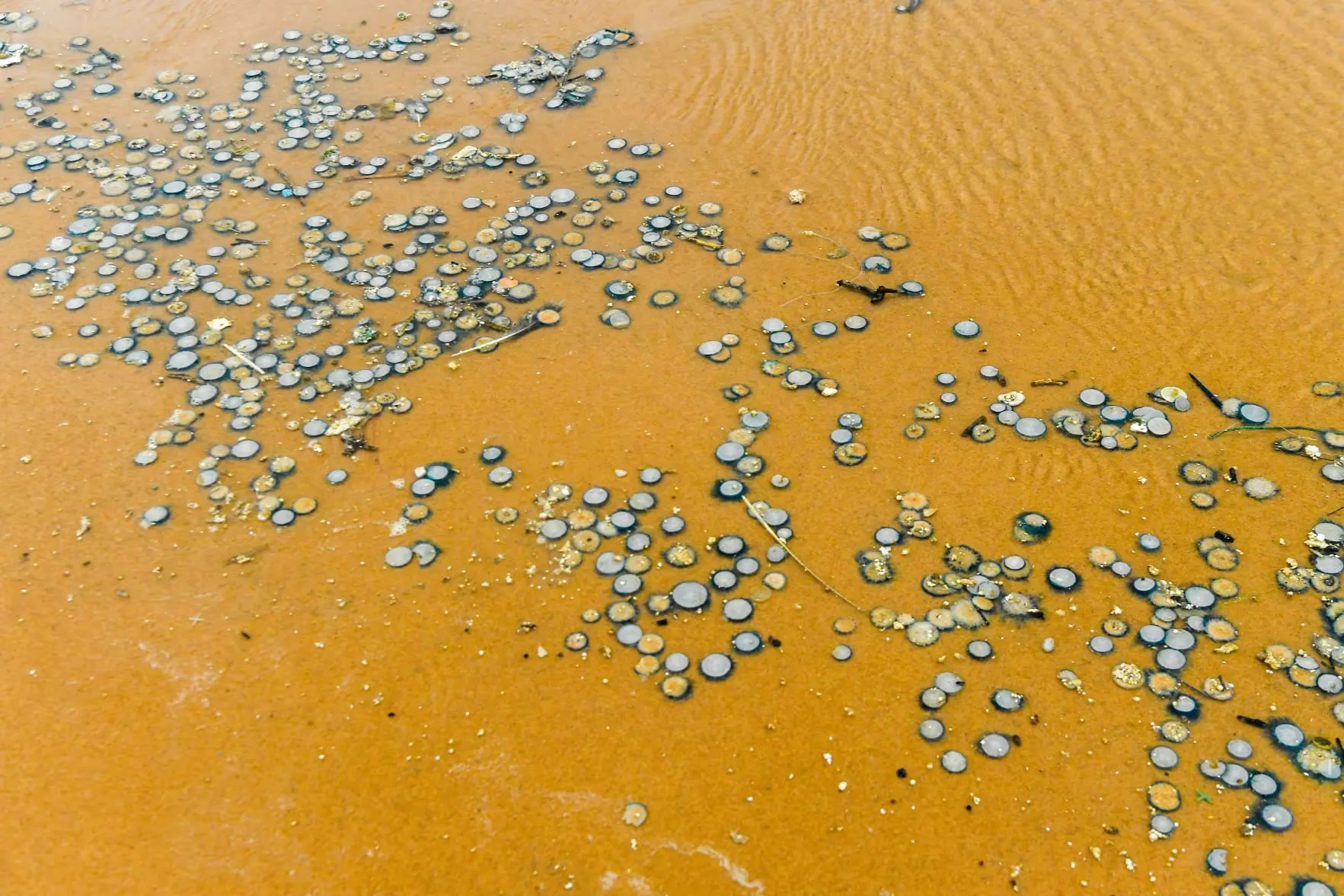 央廣網(wǎng)?10月23日消息(記者林韋瑋 付美斌 實(shí)習(xí)記者郭心怡)近日,?谑形骱0冻霈F(xiàn)大量形似“硬幣”的生物,這些生物“緊密鑲嵌”在沙灘上,遠(yuǎn)遠(yuǎn)望去,宛如無(wú)數(shù)枚銀色硬幣鋪灑在海岸線上。經(jīng)專家證實(shí),該生物為銀幣水母,具有一定弱毒性,接觸人體可能引發(fā)灼痛、紅斑或皮疹,游客在海邊游玩時(shí)應(yīng)避免主動(dòng)觸碰。