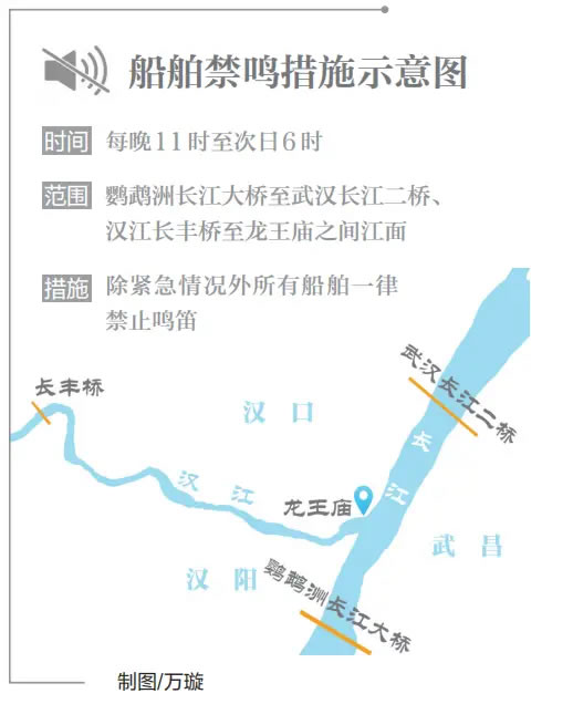 生態(tài)長江的底色愈加深厚。近日,武漢市首次在限定水域?qū)嵤┐耙归g噪聲管控。每晚11時至次日6時,武漢市鸚鵡洲長江大橋至武漢長江二橋、漢江長豐橋至龍王廟之間,總長約20公里的江面進入“靜音模式”,除緊急情況外所有船舶一律禁止鳴笛,為兩岸群眾營造優(yōu)質(zhì)夜間休息環(huán)境。