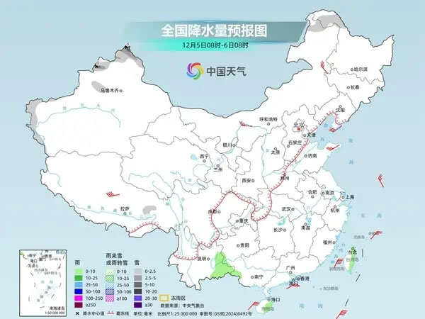 具體來(lái)看,今天,新疆北疆北部和南疆西部山區(qū)、內(nèi)蒙古東北部、黑龍江西北部、西藏東部等地部分地區(qū)有小到中雪或雨夾雪,其中,新疆北疆北部等地有大雪。貴州西南部、云南東部、廣西西部、海南島、臺(tái)灣島等地部分地區(qū)有小雨。