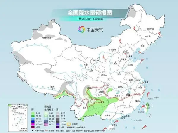 具體來(lái)看,中央氣象臺(tái)預(yù)計(jì),今天,西北地區(qū)東南部、河南西部、湖北西部、川西高原北部、貴州西北部、青海南部、西藏南部和東部等地部分地區(qū)有小到中雪或雨夾雪;四川盆地、湖北大部、湖南北部、貴州中東部、云南大部等地部分地區(qū)有小雨,其中,云南南部等地部分地區(qū)有中雨。