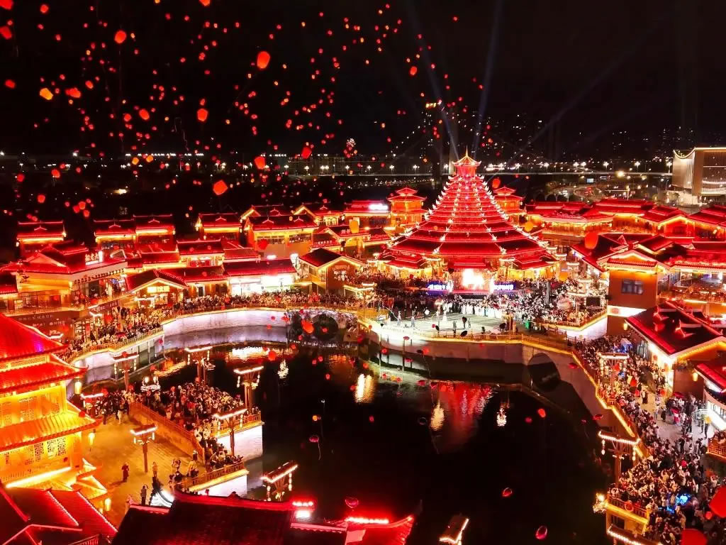 臨近午夜,榆樹(shù)灣·青春廣場(chǎng)迎來(lái)全天氛圍最高潮,游客們?cè)诳酌鳠魺裘嫔蠈?xiě)下新年愿望,在工作人員的指引下有序放飛。點(diǎn)點(diǎn)燈火隨風(fēng)飄蕩,與夜空融為一體,構(gòu)成“千盞飛燈映星河”的浪漫畫(huà)面。