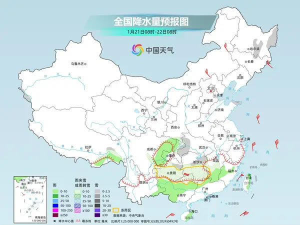 中國天氣網(wǎng)訊 今天(1月21日),南方雨雪繼續(xù)減少、減弱,但湖南、貴州等地部分地區(qū)仍有凍雨,需注意防范。明后天,中東部大部將進(jìn)入雨雪間歇期。隨著寒潮和雨雪影響結(jié)束,后天起長(zhǎng)江以南地區(qū)氣溫將陸續(xù)轉(zhuǎn)為偏高,但北方多地氣溫仍然低迷,需注意保暖。