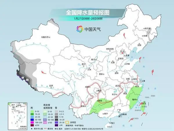 具體來看,中央氣象臺預計,今天,新疆北疆北部和南疆盆地西部、西藏西部和南部等地部分地區(qū)有中到大雪,其中,西藏西部和南部等地部分地區(qū)有暴雪到大暴雪,局地特大暴雪。湖南南部、江西中北部、浙江大部、福建大部、貴州中南部、云南東南部、廣西西部和東北部、臺灣島等地部分地區(qū)有小雨。