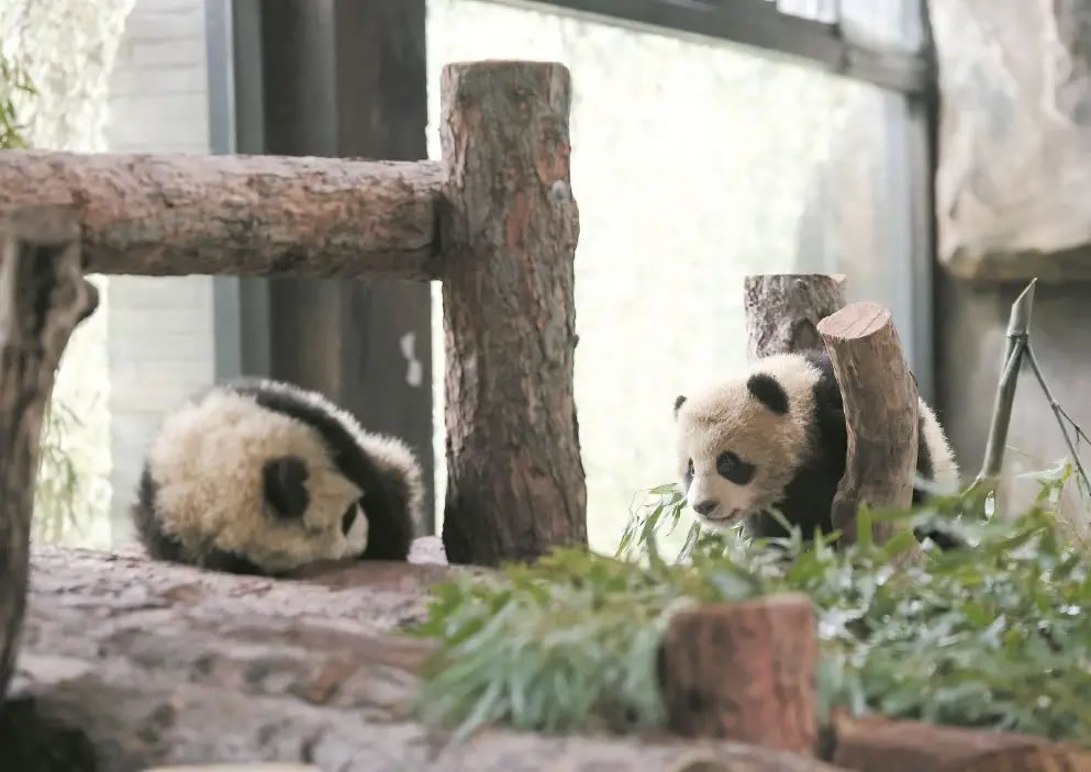 據(jù)大熊貓保育員介紹,這對龍鳳胎出生于去年8月22日,是“芊金”在滬首次產(chǎn)崽。如今雙寶即將滿半歲,體重均已突破10千克,各項生長指標良好,體格健壯、性格活潑,已掌握獨立攀爬、奔跑、飲用盆盆奶等技能。