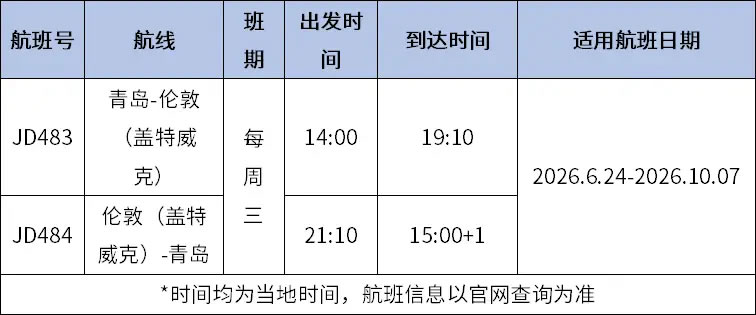 2026年夏秋航季重啟的青島往返倫敦(蓋特威克)航線,每周三固定執(zhí)飛,采用空客A330寬體機(jī)型,為英國(guó)旅客進(jìn)入中國(guó)華東地區(qū)搭建直達(dá)橋梁。借助青島航空樞紐的輻射作用,該航線可聯(lián)動(dòng)國(guó)內(nèi)多地航線,實(shí)現(xiàn)英國(guó)旅客來(lái)華后的無(wú)縫銜接。具體航班時(shí)刻如下(均為當(dāng)?shù)貢r(shí)間,航班信息以官網(wǎng)查詢?yōu)闇?zhǔn)):