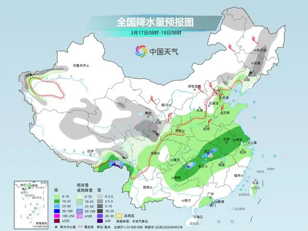 未來一周,西南地區(qū)東部至長江中下游等地多陰雨天氣,局地或有大雨,公眾外出需帶好雨具,謹(jǐn)防道路濕滑和能見度下降對(duì)交通的不利影響。此外,今明天北方降雪增多,西北地區(qū)東部局地有強(qiáng)降雪,需加強(qiáng)防范。