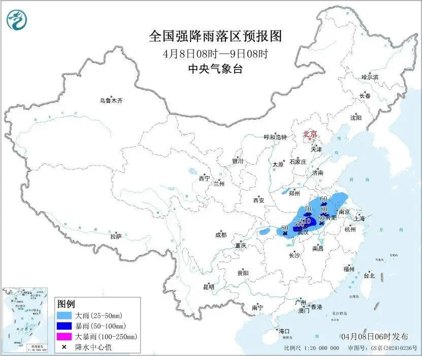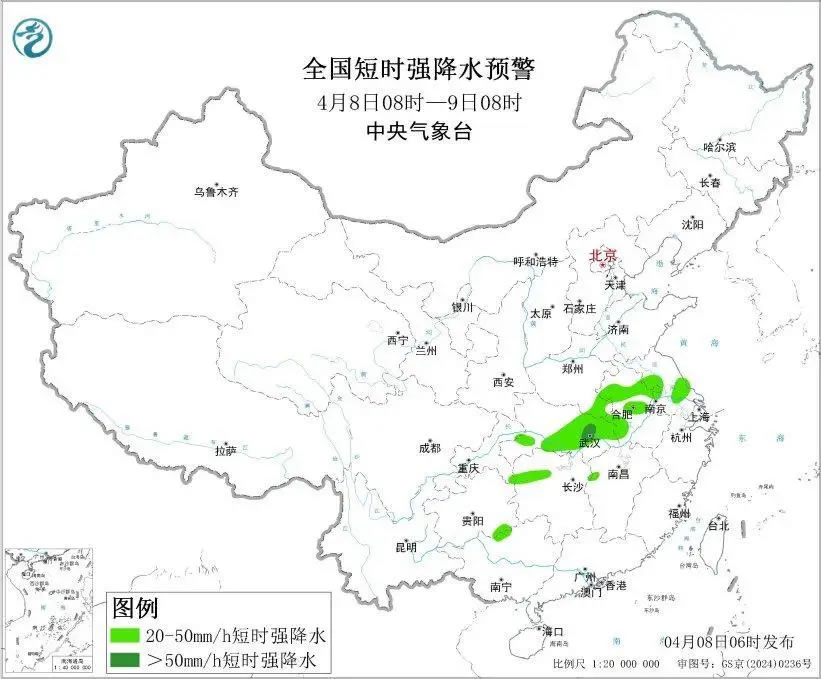 預(yù)計,4月8日8時至9日8時,湖北南部和東部、安徽中北部、河南南部、江蘇中北部等地部分地區(qū)有大到暴雨,其中,湖北東部局地有大暴雨(100~150毫米)。上述部分地區(qū)伴有短時強(qiáng)降水(最大小時降雨量20~40毫米,局地可超過50毫米),局地有雷暴大風(fēng)或冰雹等強(qiáng)對流天氣。