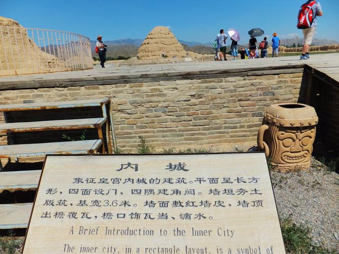 月城北側(cè)為內(nèi)城遺址,四面用神墻環(huán)繞,呈南北長(zhǎng)方形,南北長(zhǎng)180米,東西寬160米。占地約40畝。神墻中部較窄,靠近轉(zhuǎn)角漸寬大,純凈黃土分段夯筑而成,中部每段約3米,殘高約3米,比較平齊,各段如須彌座形狀。神墻四處轉(zhuǎn)角皆很高大,類圓柱形,從各轉(zhuǎn)角往神墻兩側(cè),連體圓柱愈來愈矮小,各有5個(gè),共40個(gè)。其殘存最高達(dá)6米以上,最低的3米,發(fā)現(xiàn)在轉(zhuǎn)角處5個(gè)連體圓柱夯土臺(tái)周圍皆有磚瓦殘存。內(nèi)城四面神墻皆正中辟門,門址寬約12米,地面散布瓦片、脊飾殘塊等。根據(jù)統(tǒng)計(jì),內(nèi)城坍塌墻體在2002年時(shí)已達(dá)189.1米,約占?jí)w總長(zhǎng)度的27.8%。南神門內(nèi)約25米偏西處有一處獻(xiàn)殿遺址。根據(jù)考古發(fā)掘情況看,可能原為一正方形臺(tái)基,臺(tái)面周長(zhǎng)65米,直徑約20米,堆積厚約1米。臺(tái)基以純凈黃土墊起,其上及周圍殘存大量青磚灰瓦及琉璃構(gòu)件。獻(xiàn)殿之后約6米為墓道封土,南北長(zhǎng)約42米,呈東南——西北走向,形似魚脊,以砂石填充。其末端為盜坑,盜坑直徑約20米,深約5米。坑內(nèi)長(zhǎng)有若干小樹,兩側(cè)有土堆。內(nèi)城西北隅有一處陵臺(tái),八角形,高約20米,分7級(jí),每級(jí)向內(nèi)收分。陵臺(tái)收分處及周圍地面散布大量瓦片、瓦當(dāng)、滴水等建筑材料。夯土臺(tái)整體形狀為塔形,其上露出一個(gè)個(gè)椽洞,有水平方向的,還有豎斜方向的,證明原來有椽出頭。距離陵臺(tái)較遠(yuǎn)的四角各有一座角臺(tái),其中東南、西南的兩座角臺(tái)已坍塌,西南角尚可分辨認(rèn)出臺(tái)基,相距約520米。其連線在雙闕臺(tái)之前,北面的2座角臺(tái)相距290米。東北角臺(tái)殘高1米多,坍塌嚴(yán)重,只有西北處的角臺(tái)保存比較完好,殘高約5米,但嚴(yán)重風(fēng)化。北邊兩角臺(tái)相距272米。南北聯(lián)線約460米。夯土臺(tái)因剝蝕已趨圓柱形,底面周長(zhǎng)20米。純凈黃土夯筑,周圍散落著大量紅褐色板瓦、筒瓦殘片。