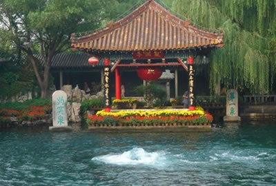 泉池西側(cè)的“觀瀾亭”建于明朝天順五年,亭內(nèi)石桌、石凳,可供游人休息賞泉之用。西墻上嵌刻的“觀瀾”為明代書法家的所書,“第一泉”石刻,是清朝同治年間書法家王鐘霖的墨跡,亭西“趵突泉”石碑,是明代山東巡府胡纘宗手筆。泉東池的北岸,水邊窗明幾凈的建筑就是素有勝名的蓬萊社,又稱望鶴亭茶社,想當(dāng)年康熙、乾隆兩個皇帝都曾在這里臨水靜坐,品茗賞泉。當(dāng)品嘗到趵突泉水后竟將南巡中攜飲的北京玉泉水全部換成趵突泉水,故有“潤澤春茶味更真”,“不飲趵突水,空負(fù)濟南游”之說。