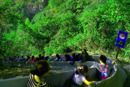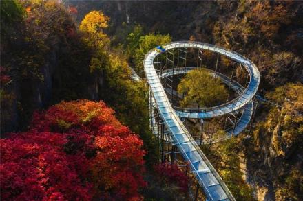 滑道自高門洞起,至空中玻璃漂流入口處止,長(zhǎng)約千米。此處山坡陡斜,樹木茂密,滑道從樹叢中順山勢(shì)蜿蜒而下,看似蟒行山間草叢中。其中有八個(gè)急彎,落差較大,乘坐滑道飛速?gòu)纳巾敾辽窖,驚險(xiǎn)刺激,樂趣無(wú)窮。