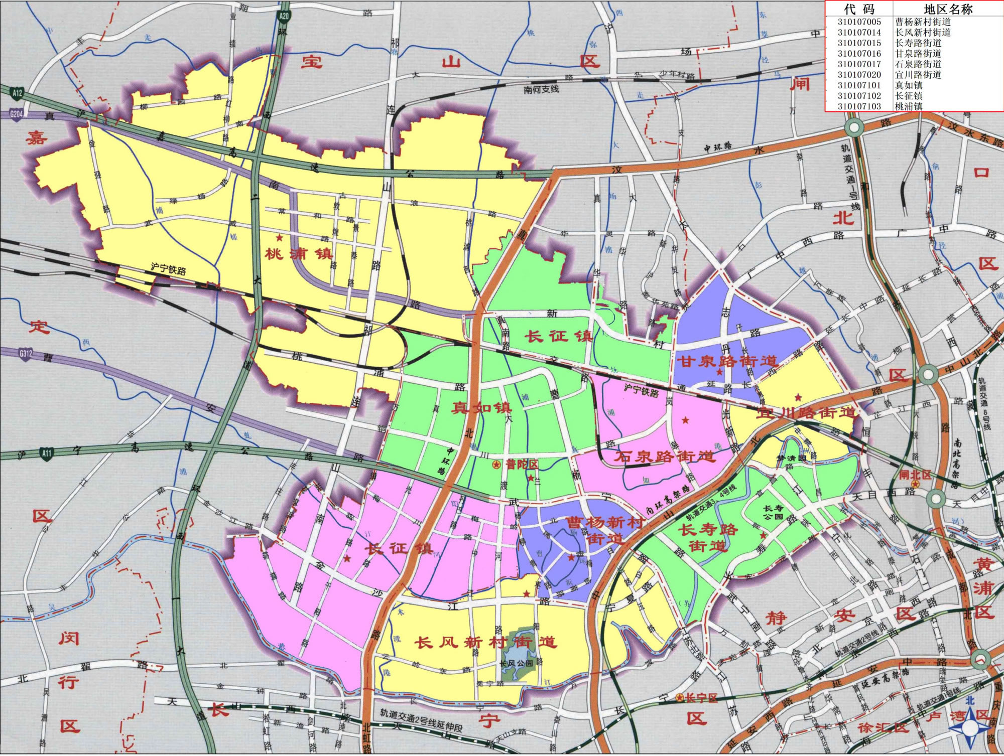 街道:曹楊新村街道、長風新村街道、長壽路街道、甘泉路街道、石泉路街道、宜川路街道、萬里街道、真如鎮(zhèn)街道
