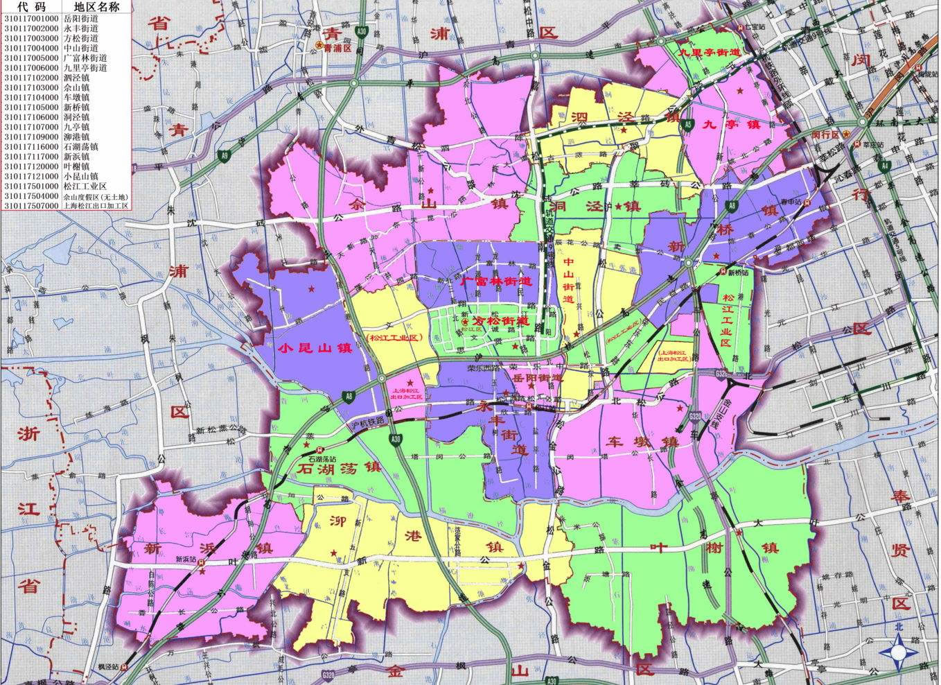 街道:岳陽街道、永豐街道、方松街道、中山街道、廣富林街道、九里亭街道
