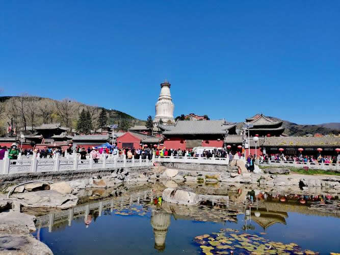 位于塔院寺后,現(xiàn)存建筑為明清兩代所修,寺宇面積八萬(wàn)余平方米,各種建筑四百余間。中軸線上殿堂七重,自前至后分別為觀音殿、文殊殿、大佛殿、無(wú)量殿、千缽殿、銅殿、藏經(jīng)殿。無(wú)量殿來(lái)說(shuō),高達(dá)21米,沒(méi)有一根梁木,全用磚塊砌成,外檐磚刻斗拱花卉,內(nèi)雕藻井懸空,形似花蓋寶頂,建造奇特。殿內(nèi)的《華嚴(yán)經(jīng)》字塔,為白綾所組成,上書(shū)60多萬(wàn)字的《華嚴(yán)經(jīng)》,蠅頭小楷,工整秀麗。銅殿三間見(jiàn)方,高達(dá)五米,外面雕鑄著花卉人物,飛禽走獸。