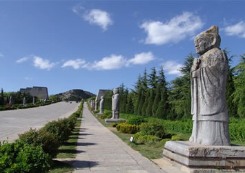 從梁山南二峰的天然雙闕起,往北依次對(duì)稱排列。端立首位的是1對(duì)高達(dá)8米有余的八棱柱石華表,這是帝王陵墓的標(biāo)志,其造型昭示著生命長存的理念和古代先民對(duì)人類生殖行為的崇拜。接著是一對(duì)昂首挺胸、渾圓壯觀的石刻翼馬,馬身兩翼雕以卷云紋,似有騰飛之勢(shì)。翼馬之北是1對(duì)優(yōu)美的高浮雕鴕鳥,是唐王朝同西域人民文化交流與友好往來的象征。緊接鴕鳥的是5對(duì)配有馭手的石仗馬和10對(duì)高4米左右的石翁仲(或稱直閣將軍)。