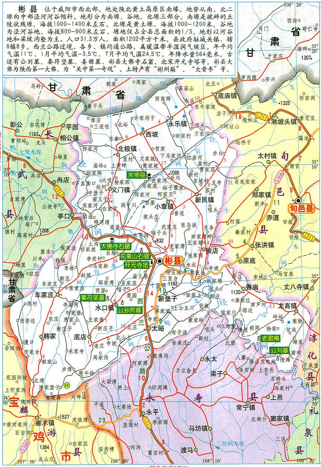 彬縣位于陜甘兩省交界處,南距咸陽120公里、西安150公里,北距甘肅平?jīng)?60公里,是連接秦隴的咽喉要道。全縣版圖形似正寫的“人”字,涇河自西而東斜貫其中,將全縣分為南北兩塬一道川。全縣轄8鎮(zhèn)8鄉(xiāng)246個(gè)行政村,總?cè)丝?2萬,其中農(nóng)業(yè)人口28.8萬,總面積1183平方公里,耕地面積60萬畝。彬縣歷史悠久,是中國古代農(nóng)業(yè)的發(fā)祥地之一。