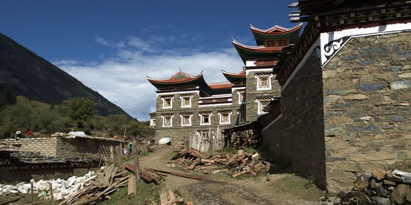 木雅人的房子中的一種形式與羌、嘉戎人的房子相似。“黑石為室”高數(shù)丈,一般三層,下層為養(yǎng)畜、中層住人、上層曬放柴草。住人的地方設(shè)有經(jīng)堂、茶房、臥室、涼臺、敞房和廁所。他們很少依山而居,一般房屋都筑在平地上。