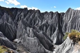 八美石林由三疊紀板巖構成。受第四紀以來的新構造運動影響,沿康定—道孚—爐霍一線形成了著名的鮮水河斷裂帶,斷裂帶中的巖石,受到擠壓、剪切,發(fā)生破碎、糜化,形成構造糜棱巖,它在八美附近最為典型和集中。斷裂活動形成的糜棱巖由于青藏高原隆升而被暴露出地表,這些膠結疏散的糜棱巖,遭受流水的沖刷,風雪的鏟刮,重力崩塌等風化作用,就形成了狀若石林。因這種巖石軟弱且含鈣質,大自然風雨流水的侵蝕便把它雕塑成了千姿百態(tài)、雄奇壯觀的土石林景觀。