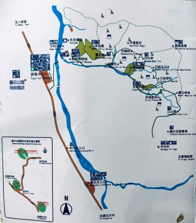 中國墨石公園景區(qū)位于四川省甘孜州道孚八美鎮(zhèn)卡瑪村與中古村交界處,地處中國最美景觀大道318國道核心區(qū),緊鄰丹巴美人谷、康定新都橋、雅江康巴漢子村等知名景區(qū),距八美鎮(zhèn)約6公里,川藏公路旁400米處。面積5平方公里,海拔約3500米。是香格里拉之巔海螺溝通向香格里拉之魂稻城亞丁的中轉站,擁有壯美草原、婉約濕地、奇幻墨石、特色民居、高原花海、金色彩秋、白塔圣寺、日出日落八大奇觀!按嘿p格桑夏避暑,秋觀彩林冬踏雪”是一年四季風光的特色,而綿延在鮮水河斷裂帶上的墨石天然景觀更為世人向往,被譽為“中國最美景觀大道第八美”。