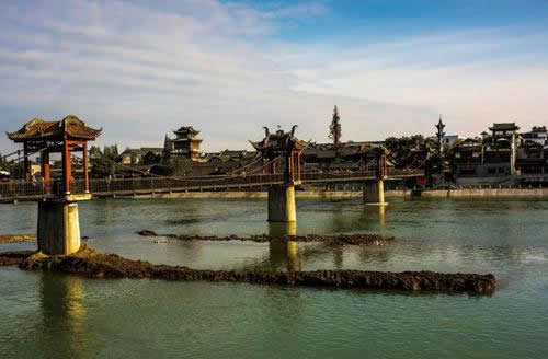 元通古鎮(zhèn)三面環(huán)水,一面環(huán)山。千百年來,滾滾江水滋潤著這方神圣的土地。江岸之外良田萬頃,古鎮(zhèn)街頭院落森森。大小不一的街巷保存完好,木板房、青瓦房相連成片,遺存至今的古老民居,泱泱然散發(fā)著濃濃的古韻,挪動(dòng)著每一寸腳步,推開每一扇窗欞,似乎都闖開了歷史的大門自己也便,情不自禁、身不由己地也便走進(jìn)了過去,走進(jìn)了歷史。走進(jìn)元通深處,一幢幢民房,一條條街巷,摸著這歷史的邊邊角角,終于找到了心靈的歸宿。元通古鎮(zhèn)依山傍水一路修來,鎮(zhèn)上的主要建筑都沿文井江拔地而起,上千戶人家臨河而居,水是他們的寄托,水是他們的立命之本,水與這里的人結(jié)下了不解之緣。所以,生活在這里的居民,家家的后院里都有石階可以下到河邊。古時(shí),鎮(zhèn)上的人出行大都靠水遠(yuǎn),家家戶戶都順著后門的石階進(jìn)進(jìn)出出,那情形有如走進(jìn)了以一處江南水鄉(xiāng)。在江河之上,一道鐵橋?qū)⒐沛?zhèn)與外灘緊緊地連在一起,時(shí)疏時(shí)密的鄉(xiāng)民在橋上來來去去,如履平地。這座橋名叫匯江橋,全長164米、寬2、5米、高6米,造型古雅,除兩端橋樓,中間幾座帶歇山項(xiàng)的涼亭在寬闊的江面上頗顯風(fēng)致,橋下是文錦江,味江和泊河江在元通的匯流之處,流床寬闊,水流湍急,極為有利于水上航運(yùn)。據(jù)方志載,古運(yùn)通航,元通堪以重任,從此起航,須經(jīng)白馬渡,陳家渡、方渡,再順著崇州境內(nèi)最大最長的河流――西河到新津龍王渡,然后進(jìn)入岷江,這段30余公里的航道乃為崇山十分重要水上交通。正是通過這條航道,元通境內(nèi)的土特產(chǎn),才得以遠(yuǎn)銷樂山、宜賓、瀘州等地,同時(shí)他們也從這條道上獲得了生活中的日用百貨,因元通是物流的集散地。同時(shí),外地客商也多聚匯于此,于是元通市井繁榮,生意興隆,到清咸豐年間終成大鎮(zhèn)。匯江橋雖造型古雅,但是一座現(xiàn)代橋,其修建年代竟為1986年,據(jù)載,最早的鐵索橋建于清光緒年間,長達(dá)130余米,氣勢宏大壯觀,因晚清末年清明會(huì)時(shí)人多坍塌,其后人元通人又募資再建,造型如同今日,可惜毀于“文革”風(fēng)暴,視橋?yàn)榍楦屑耐械脑ㄈ,出于對歷史的情感顧念,再次集資修建了索橋。
