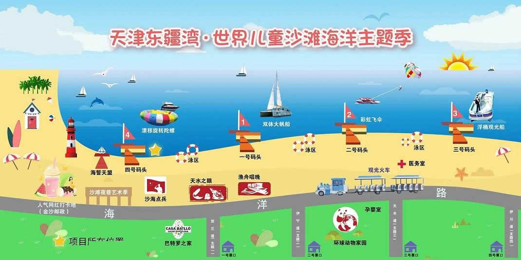 景區(qū)還將增添激情水上飛碟、快艇漂移、水上沙發(fā)、水上UU船、帆船、海上滑梯、海上蹺蹺板等數(shù)十項大型游樂設(shè)施,讓這里真正成為海上“迪士尼”。作為配套設(shè)施,在人工海灘西側(cè)修建濱海路,全長1.3公里,道路寬24米,為景區(qū)內(nèi)步行觀景道路,道路兩側(cè)綠化面積約6700平方米。綠化廣場總面積12萬平方米,景區(qū)停車場總面積約4700平方米。景區(qū)設(shè)置為沙灘親水區(qū)、沙灘游泳休閑區(qū)、水上運動休閑中心和水上休閑娛樂區(qū)。其中,位于沙灘游泳休閑區(qū)已經(jīng)建成的海景會所,是目前國內(nèi)北方最大的單體木結(jié)構(gòu)海景酒店會所,設(shè)有餐飲、住宿、淋浴、商務(wù)、娛樂等設(shè)施,并提供有地道的天津狗不理包子。另外,會所周邊正在建設(shè)游艇會所、五星級酒店、運動廣場、低密度住宅、高爾夫球場等設(shè)施。配套服務(wù)設(shè)施將逐步完善。