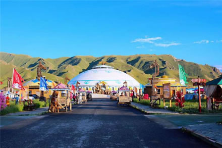 文化村是以當(dāng)?shù)赝翣栰杼厣钇鹁幼∷,以及一些生活中息息相關(guān)的物資修建而成,其中最引人注目的是中間最大的土爾扈特蒙古族汗帳。旅游季節(jié)在這里演藝大型舞臺(tái)實(shí)景劇《東歸印象》,該劇根據(jù)清乾隆三十六年(1771年)土爾扈特蒙古族克服重重艱難險(xiǎn)阻返回祖國(guó)懷抱的故事改編,該劇分《起義》《回家》《民族文化節(jié)日》三篇,演繹了東歸的過(guò)程和回歸后的幸福生活,演出場(chǎng)面宏大。當(dāng)?shù)氐哪撩瘢砂僦获R匹、黑頭羊、牦牛、駱駝也參與演出,穿越時(shí)空,將東歸歷程中的愛(ài)情、親情、友情完整呈現(xiàn)。