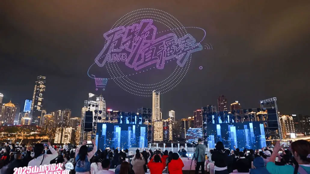 20時08分,五千架無人機(jī)騰空而起,在夜空中呈現(xiàn)“渝小e”“陳麻花”“萍姐火鍋”等定制畫面,將品牌故事升華為城市記憶。